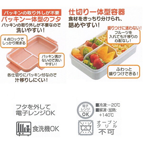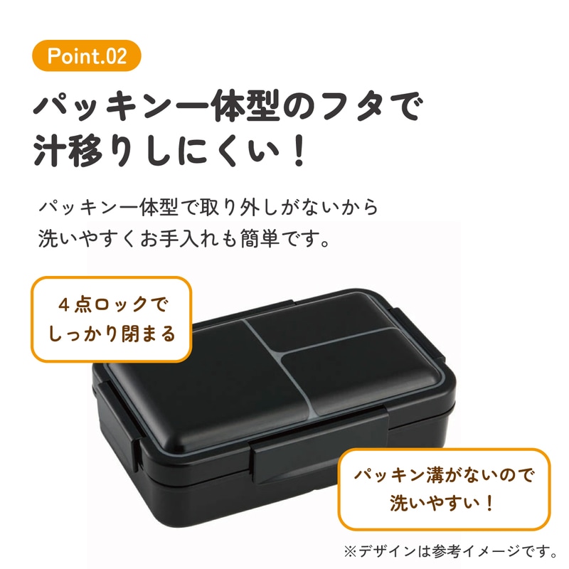 パッキン一体型のフタで各仕切りにパッキンが付いているので、汁移りしにくい!