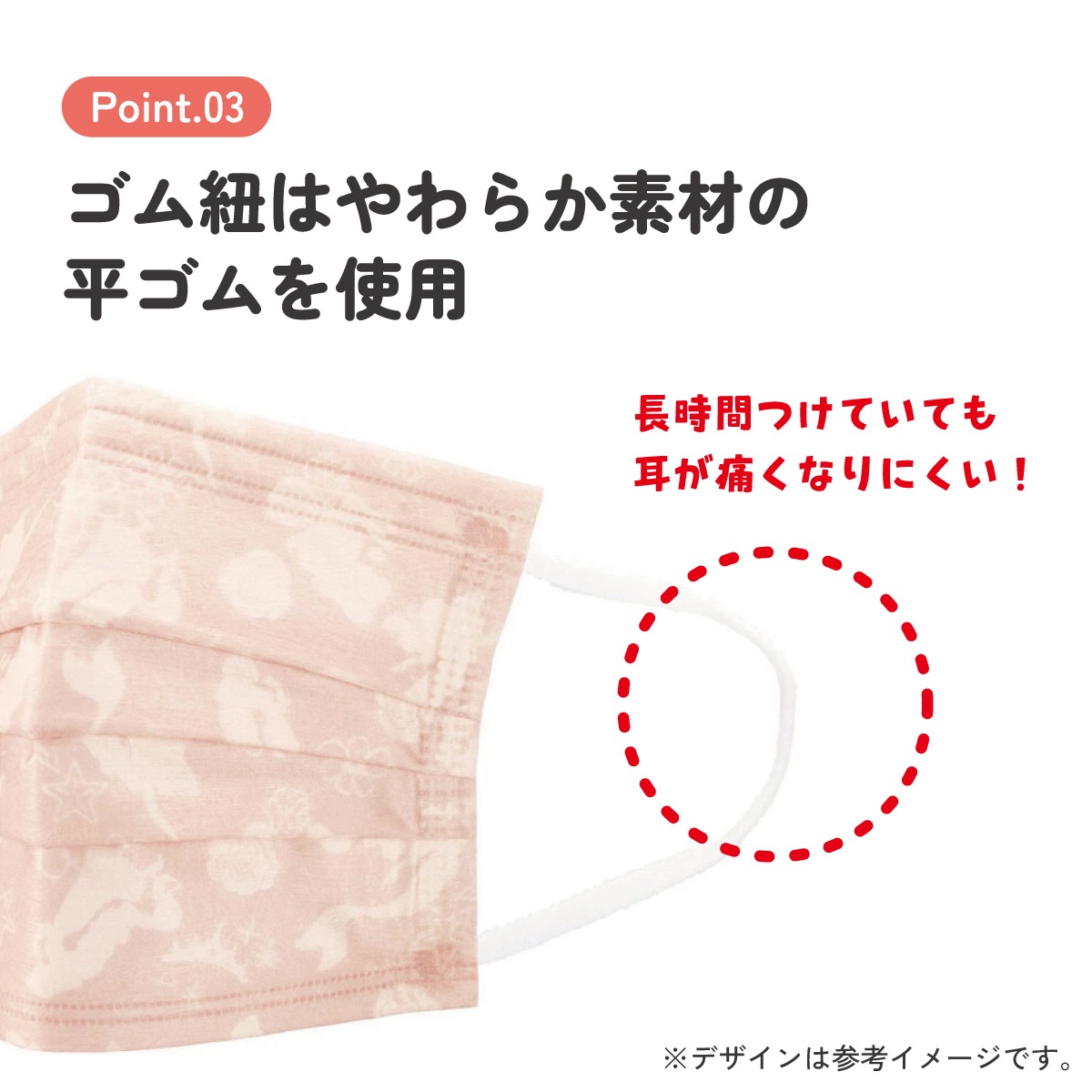 耳が痛くなりにくいやわらか素材の平ゴムを使用。