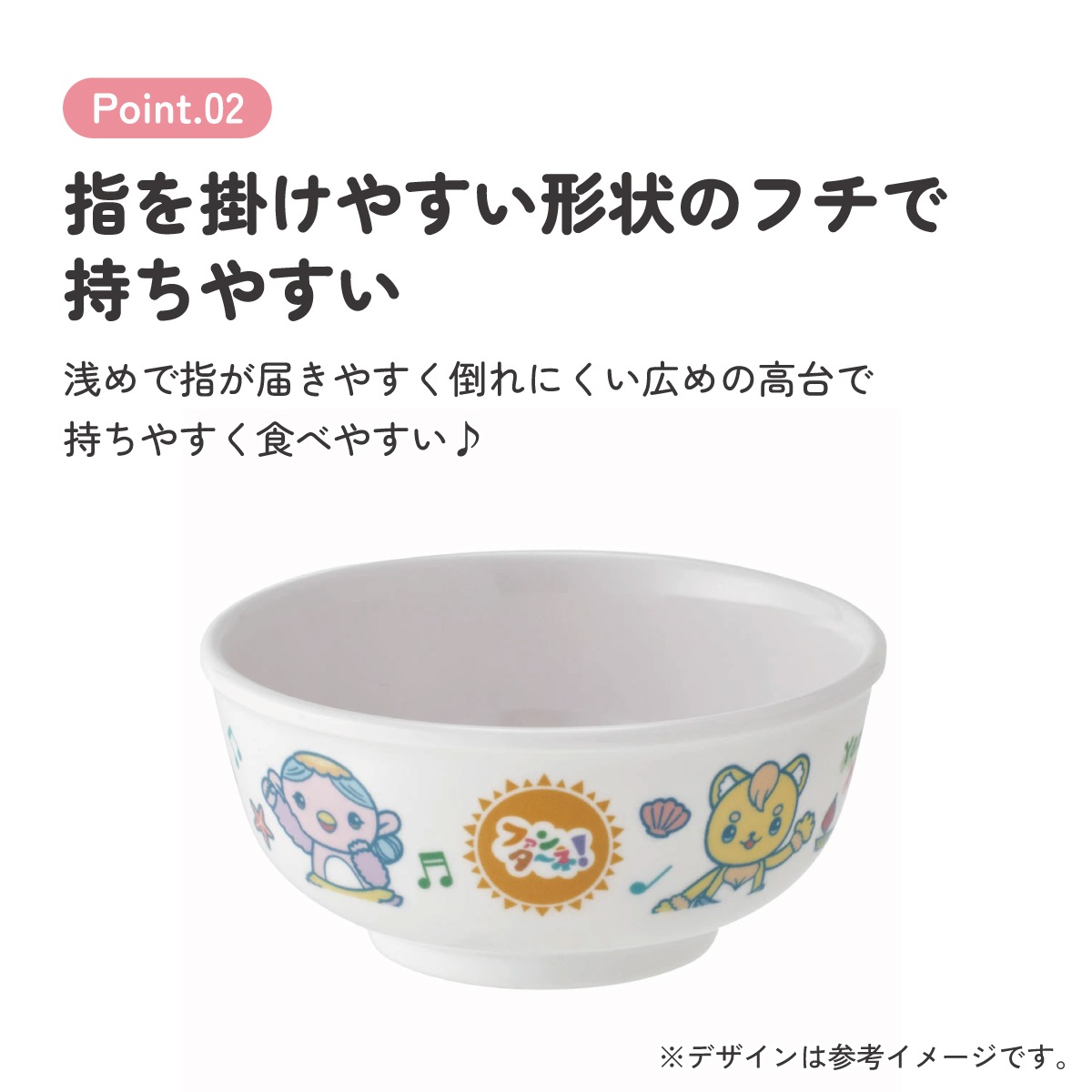 指を掛けやすい形状のフチと、浅めで指が届きやすく倒れにくい広めの高台で持ちやすく食べやすい♪
