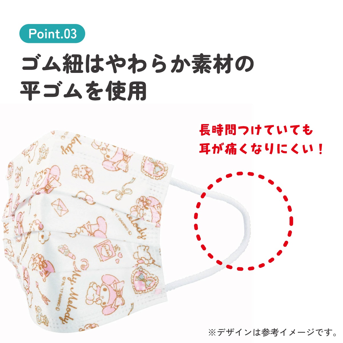 耳が痛くなりにくいやわらか素材の平ゴムを使用。