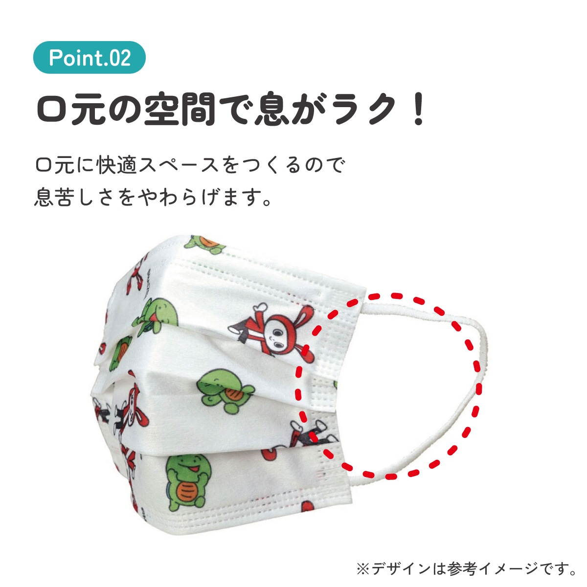 肌ざわりの良い快適シート口元の空間が快適スペースをつくるので、息苦しさをやわらげ呼吸がラクラク♪