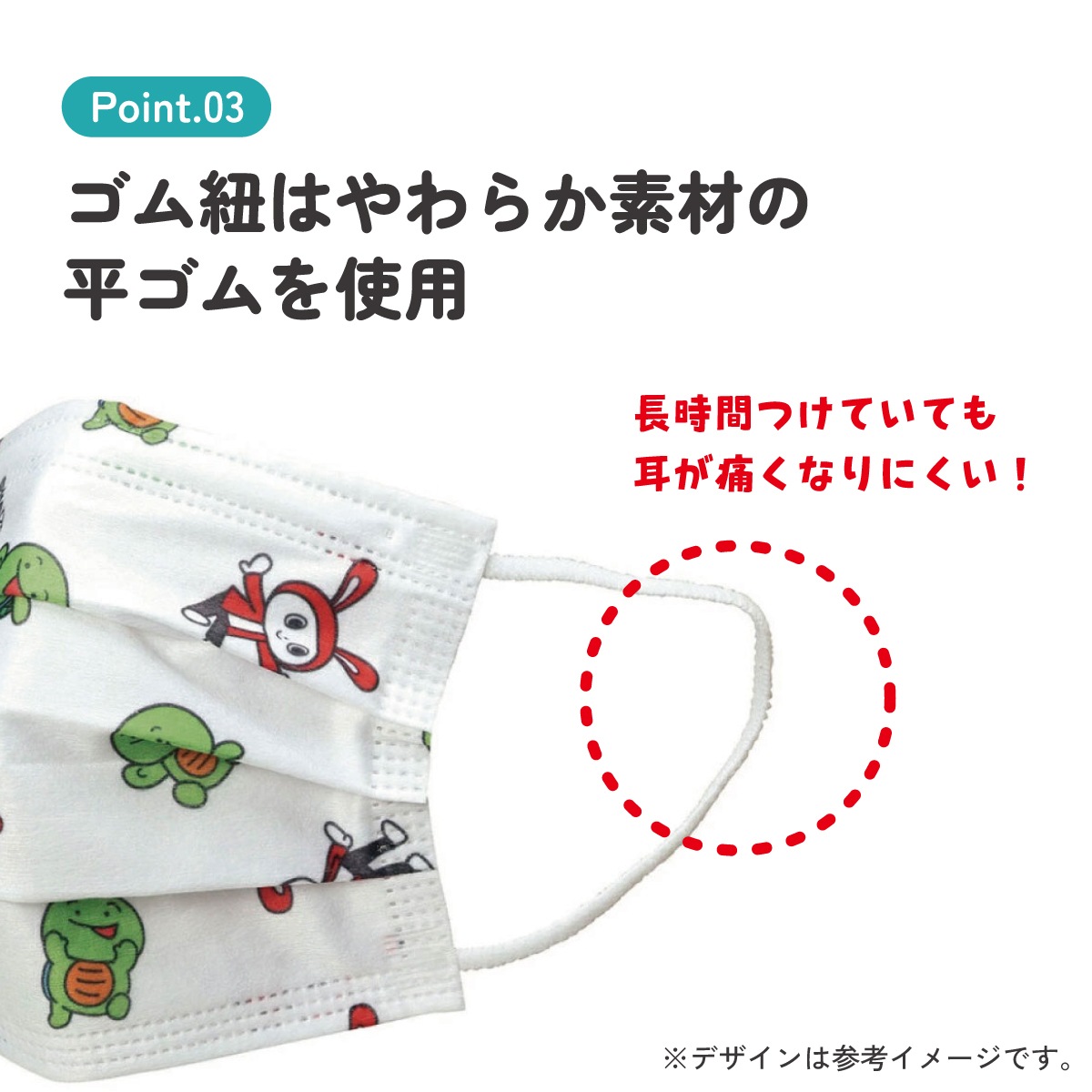 耳が痛くなりにくいやわらか素材の平ゴムを使用。