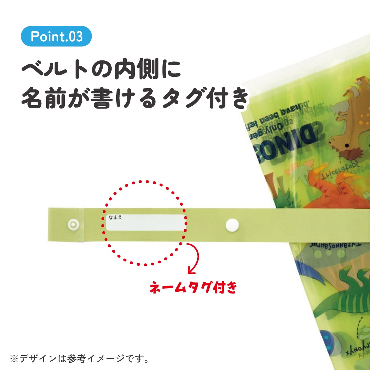 ベルトの内側に名前が書けるタグ付き。