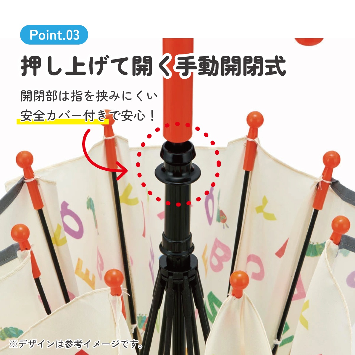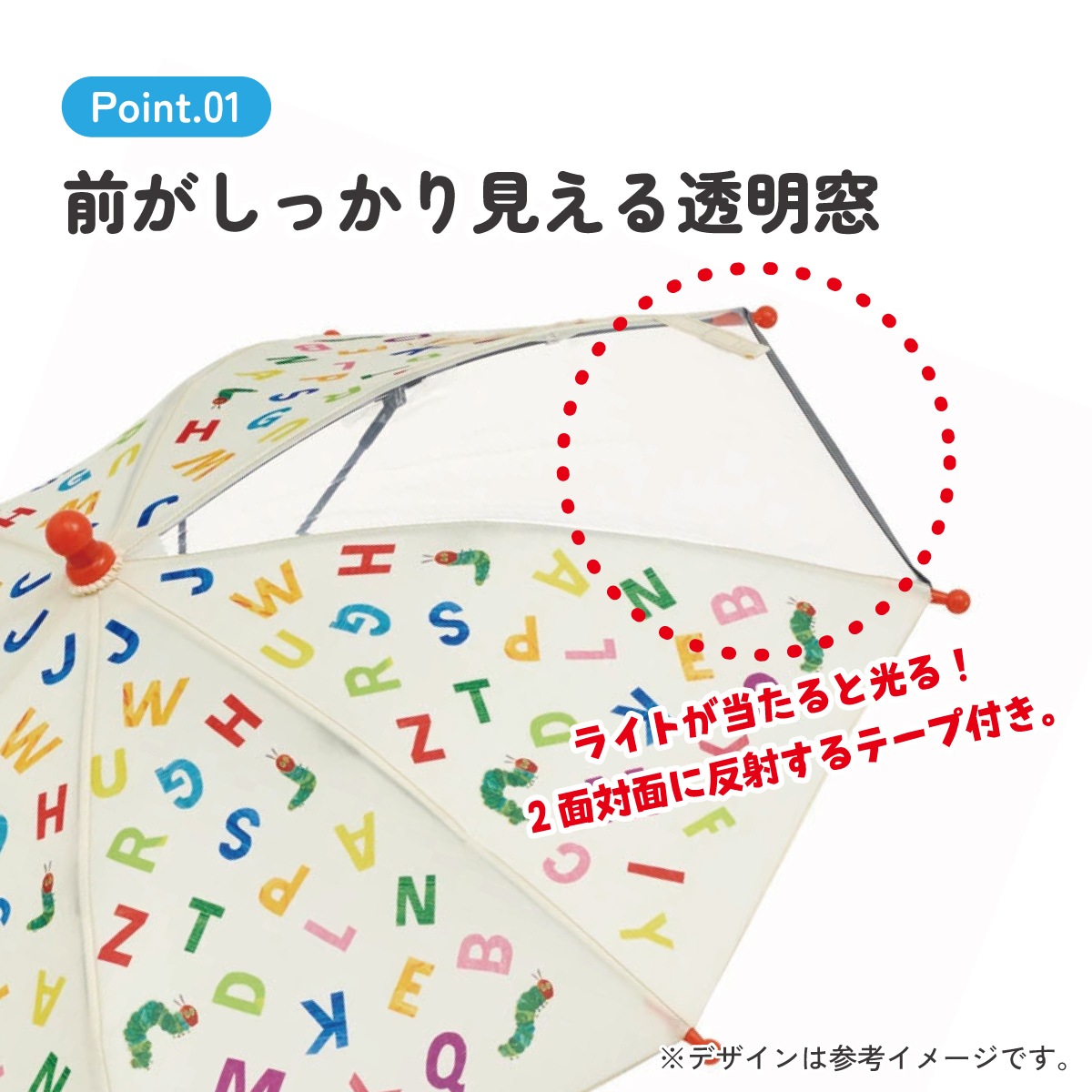 ポリエステル 雨傘 長傘 グラスファイバー骨 透明窓付き 反射テープ付き 名前スペース 手開き 手動開閉式 子供用 キッズ 対応身長約85~95cm 開閉部安全カバー付き はらぺこあおむし はらぺこ 男の子 女の子 女子