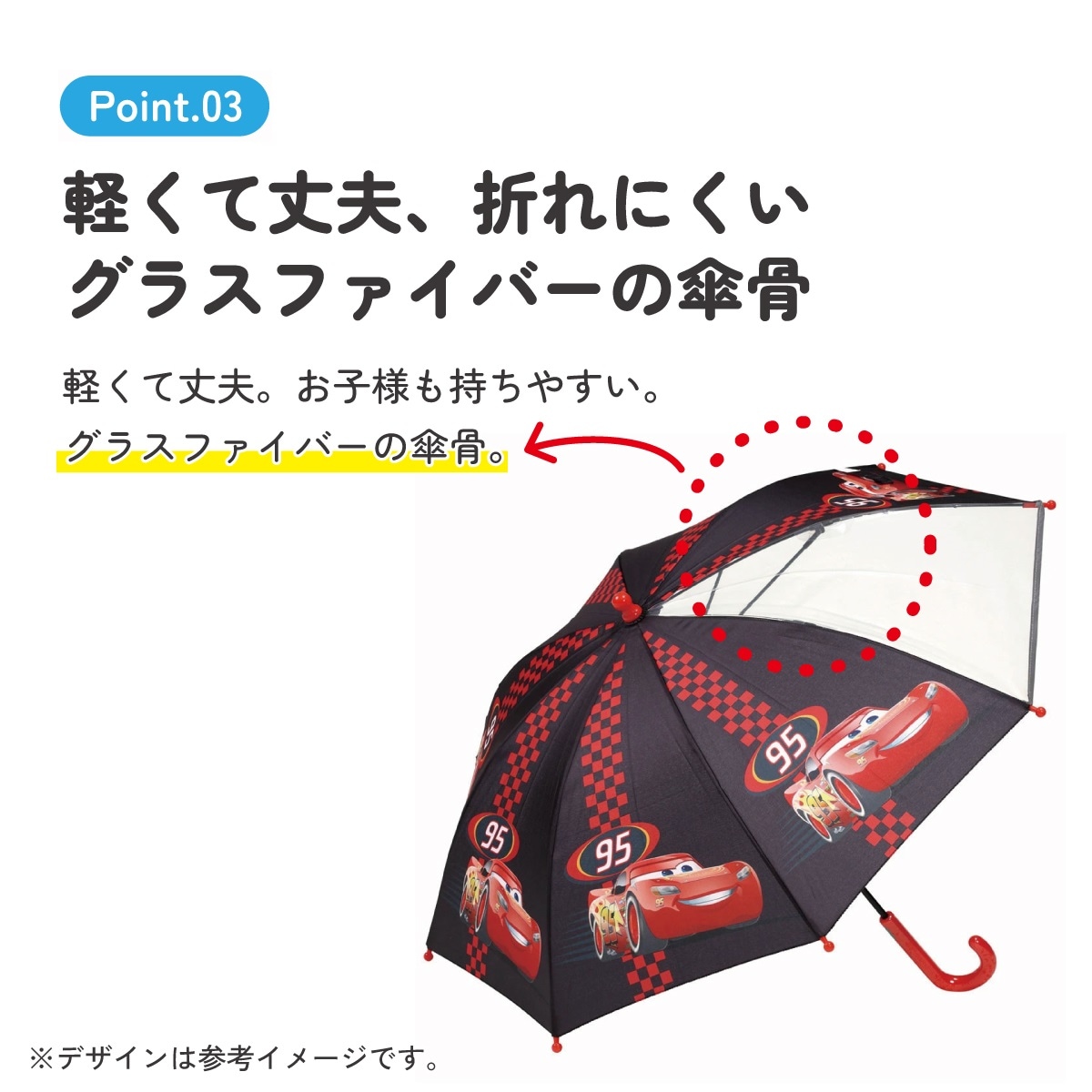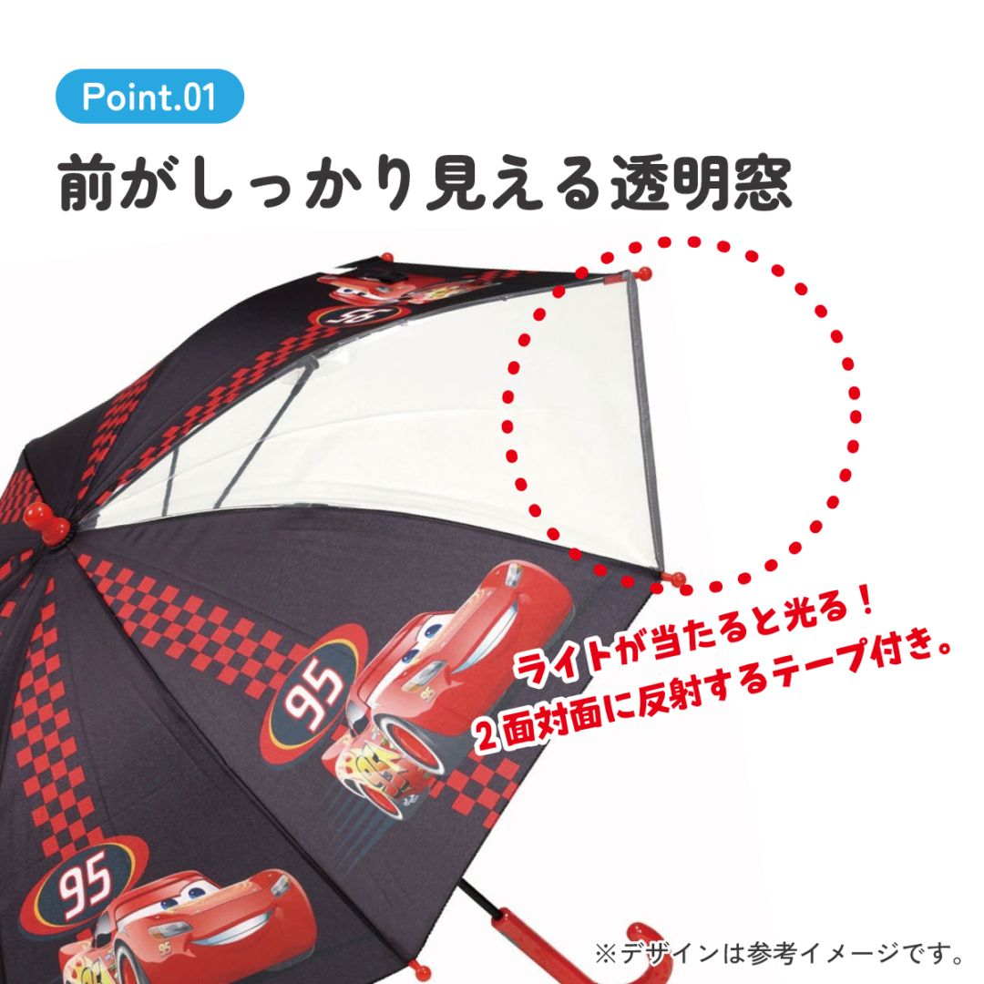 ポリエステル 雨傘 長傘 グラスファイバー骨 透明窓付き 反射テープ付き 名前スペース 手開き 手動開閉式 子供用 キッズ 対応身長約105~125cm 開閉部安全カバー付き カーズ Cars ディズニー Disney 男の子 男子
