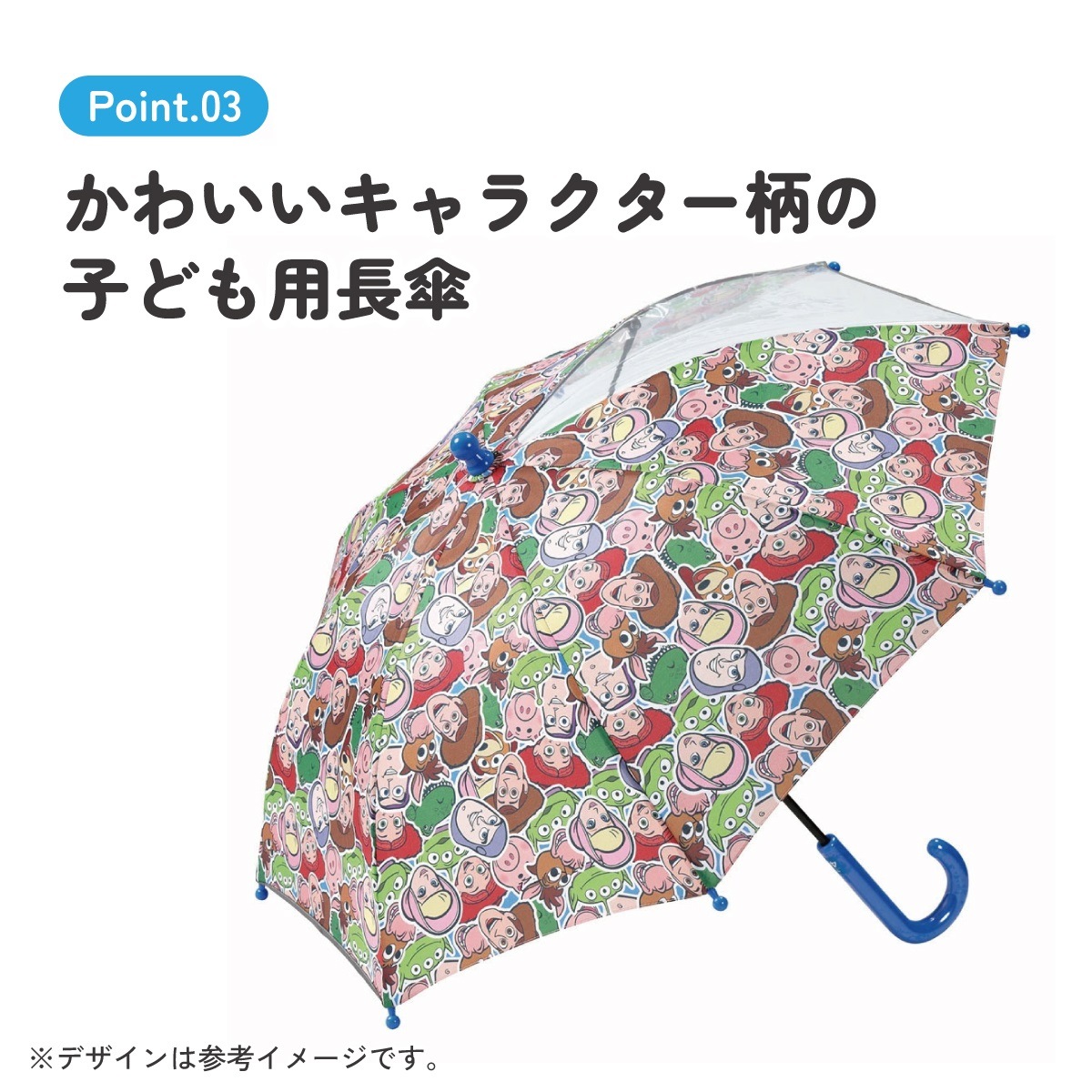 ポリエステル 雨傘 長傘 グラスファイバー骨 透明窓付き 反射テープ付き 名前スペース 手開き 手動開閉式 子供用 キッズ 対応身長約95~105cm 開閉部安全カバー付き トイストーリー トイ・ストーリー 男の子 女の子
