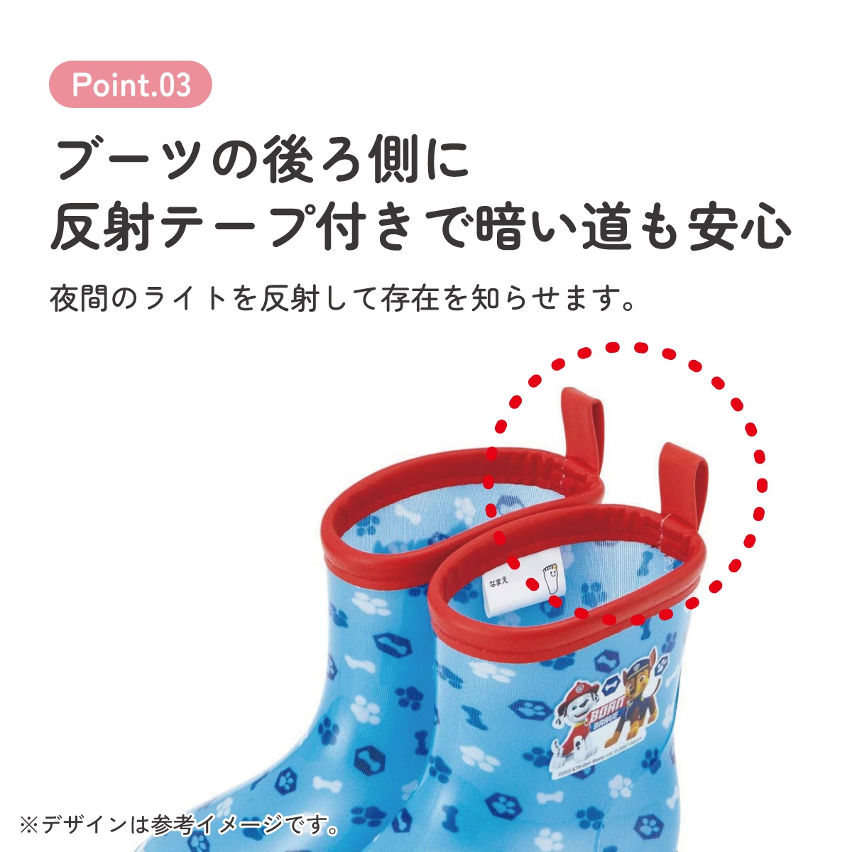 ブーツの後ろ側に雨の日に安心な反射テープ付き。