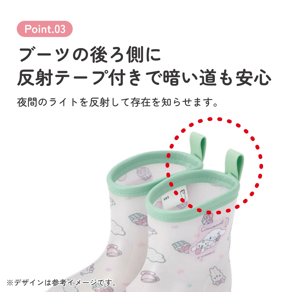 ブーツの後ろ側に雨の日に安心な反射テープ付き。