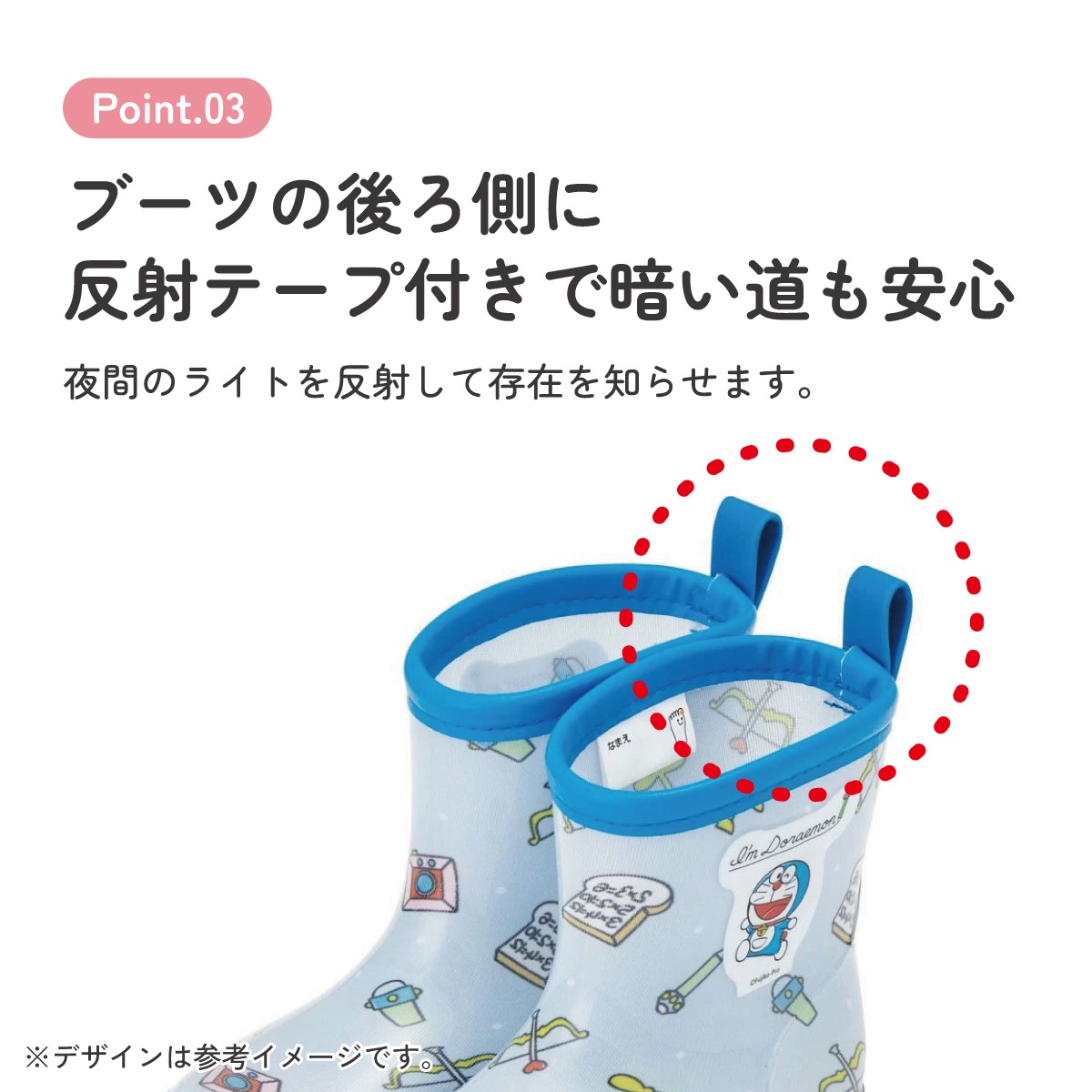 ブーツの後ろ側に雨の日に安心な反射テープ付き。