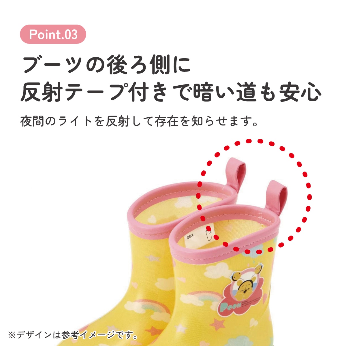 ブーツの後ろ側に雨の日に安心な反射テープ付き。