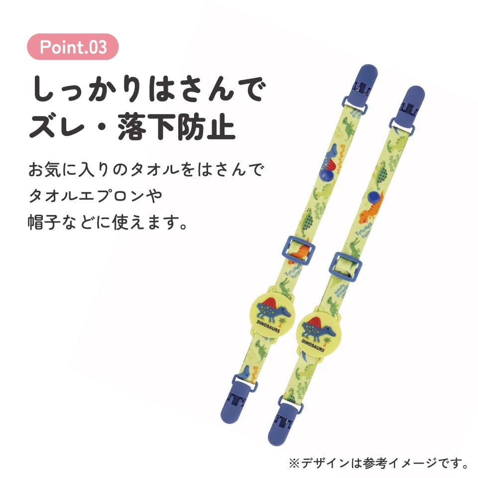 お気に入りのタオルをはさんでタオルエプロンや帽子などに使えます。