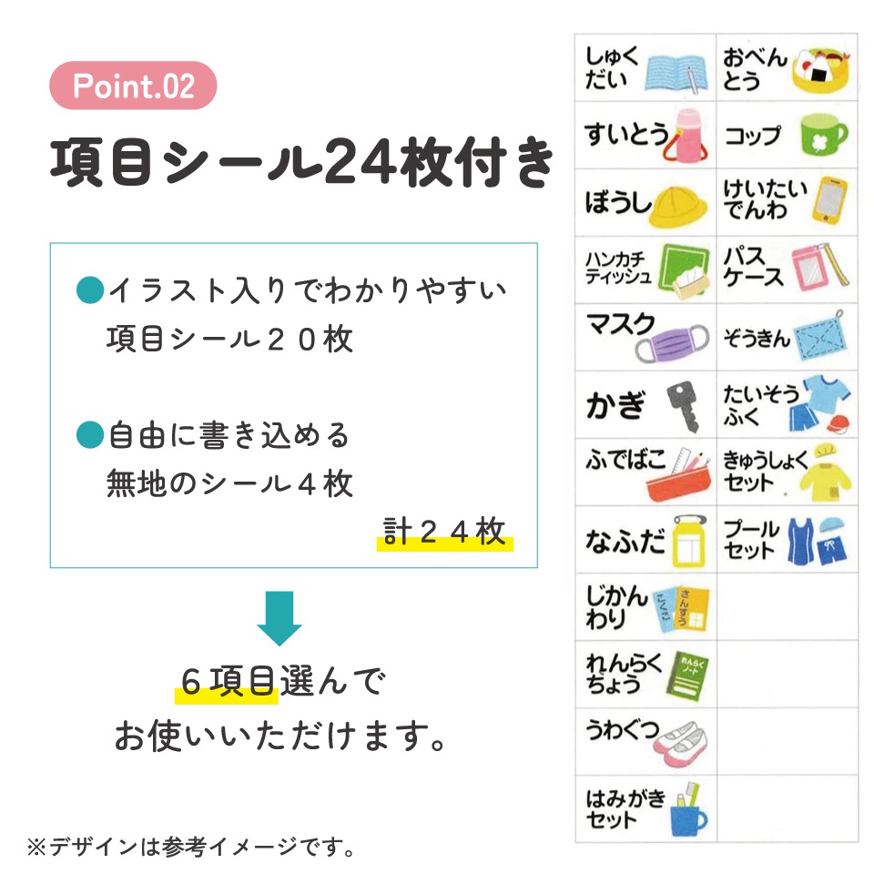 イラスト入りでわかりやすい項目シール20枚、自由に書き込める無地のシール4枚、計24枚入り!