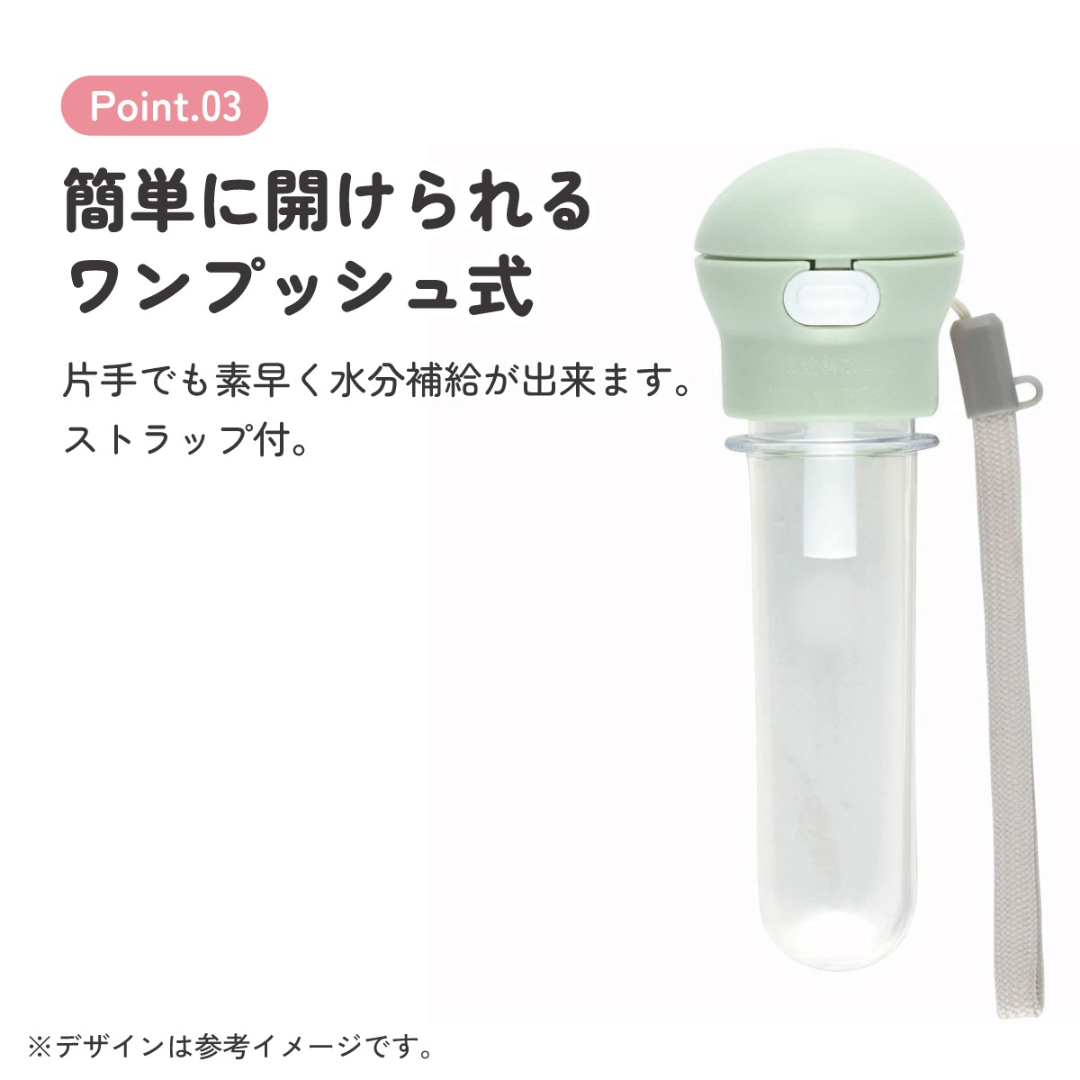 簡単に開けられるワンプッシュ式で片手でも素早く水分補給が出来ます。
