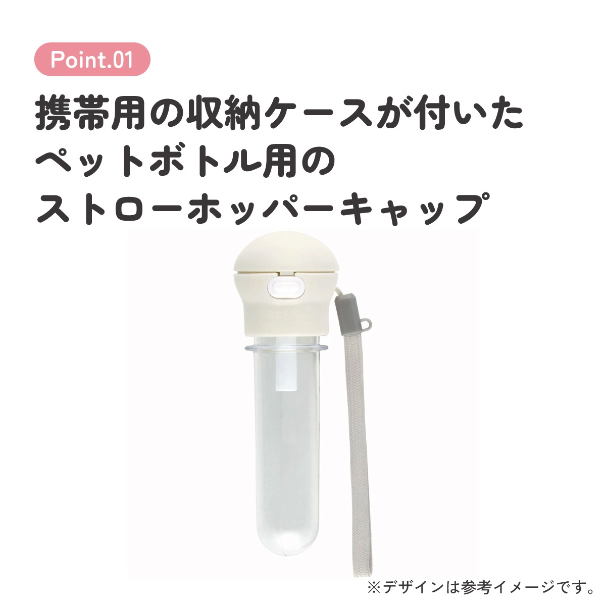 携帯用の収納ケースが付いたペットボトル用のストローホッパーキャップです。