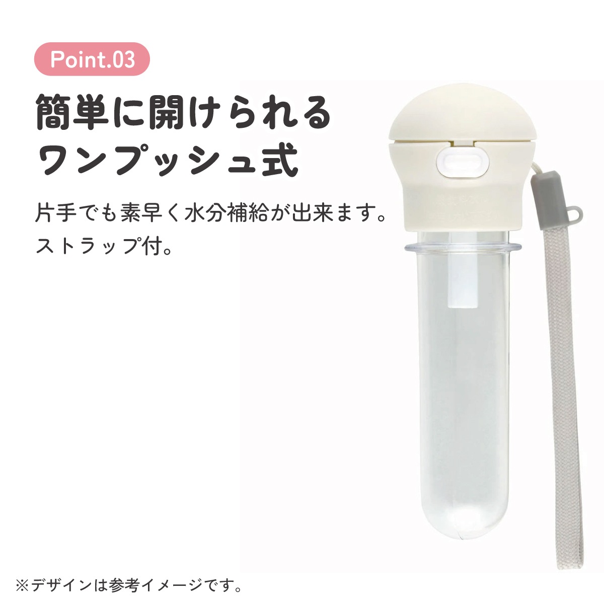 簡単に開けられるワンプッシュ式で片手でも素早く水分補給が出来ます。