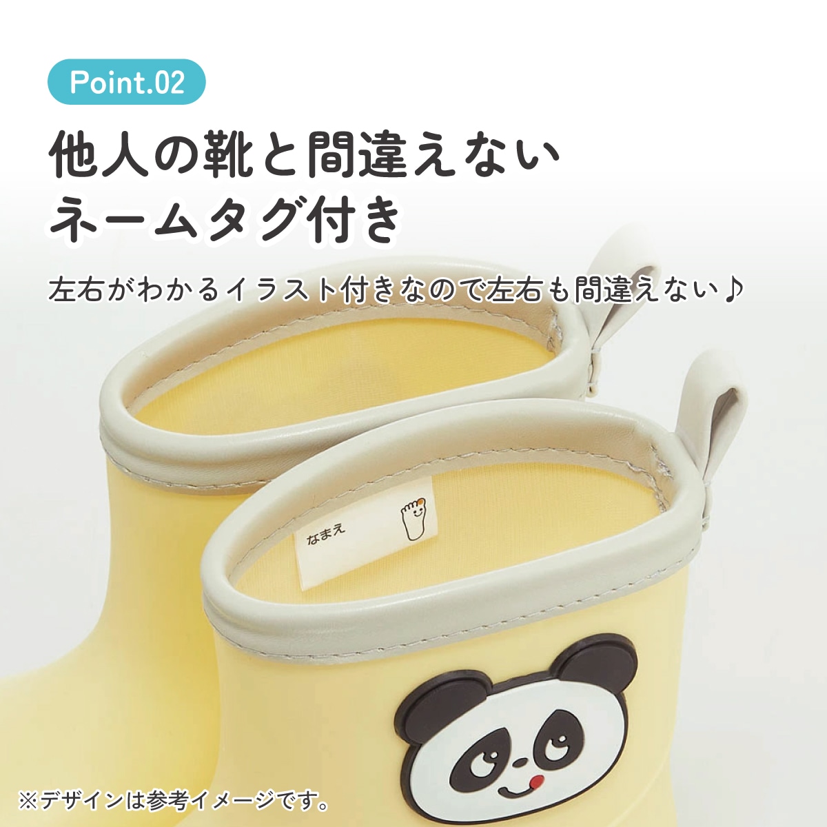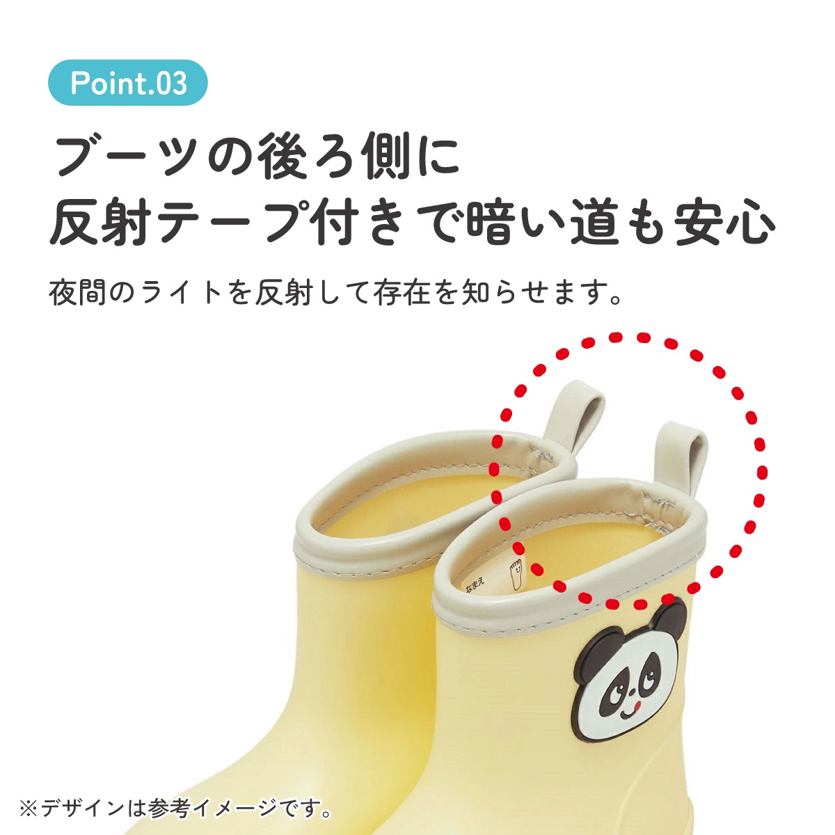 ブーツの後ろ側に雨の日に安心な反射テープ付き。