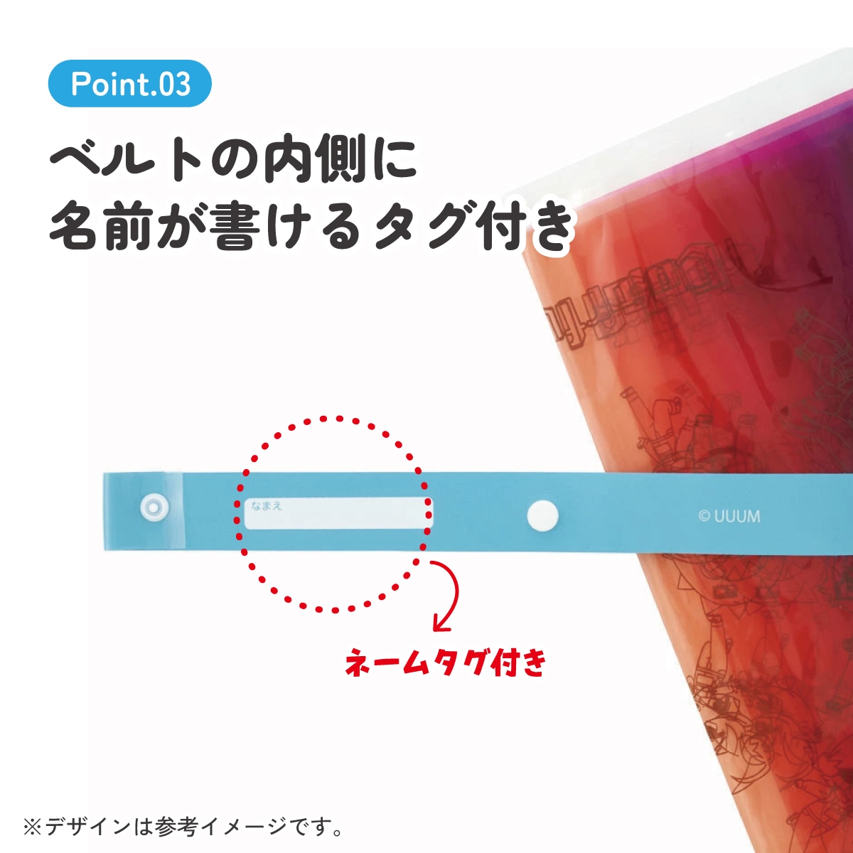 ベルトの内側に名前が書けるタグ付き。