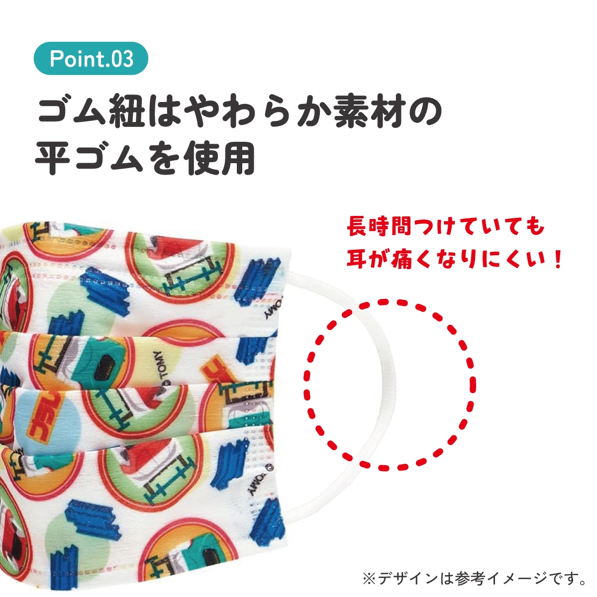 耳が痛くなりにくいやわらか素材の平ゴムを使用。