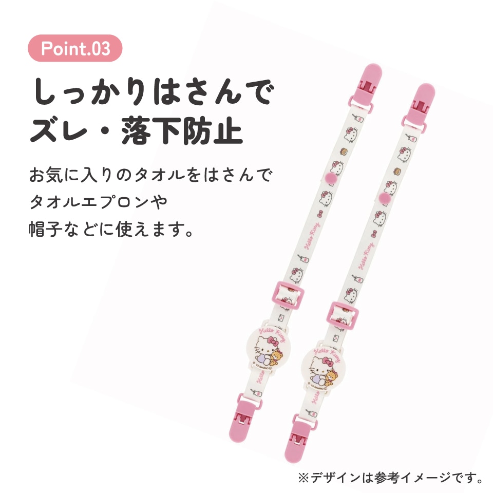 お気に入りのタオルをはさんでタオルエプロンや帽子などに使えます。