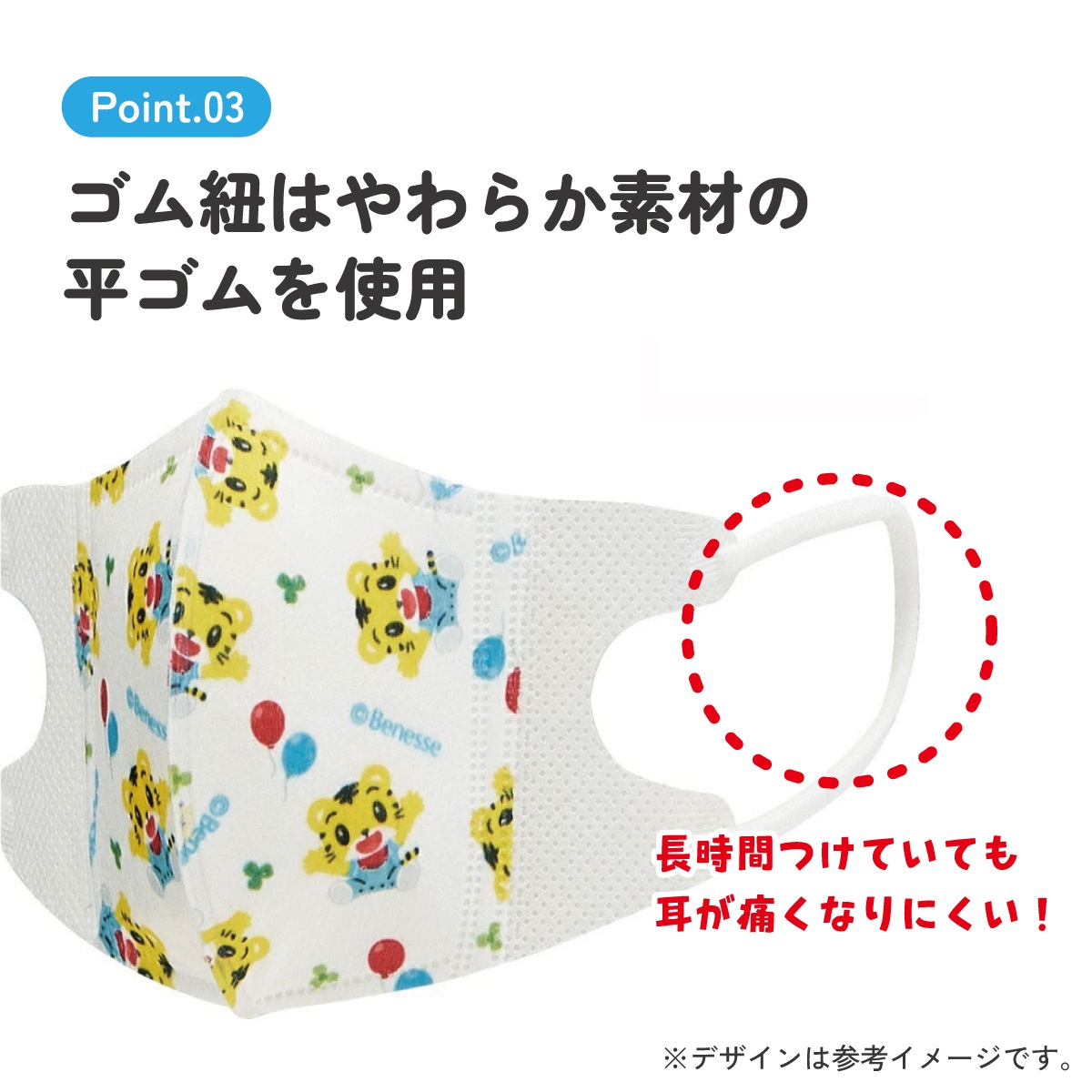 耳が痛くなりにくい、やわらか素材の平ゴムを使用。