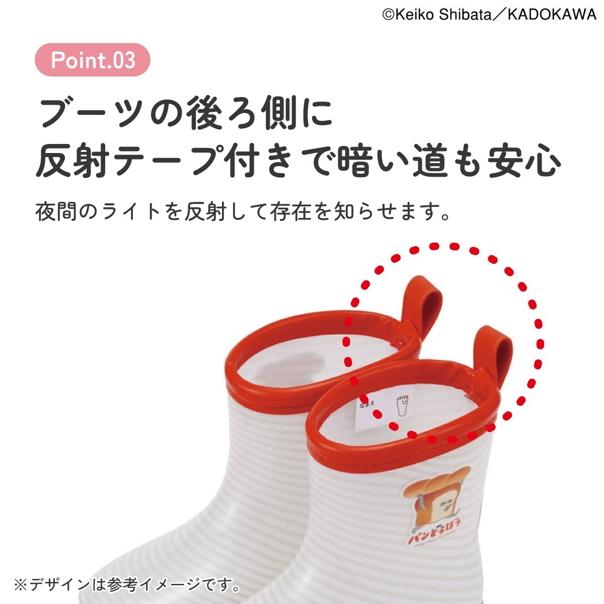 ブーツの後ろ側に雨の日に安心な反射テープ付き。