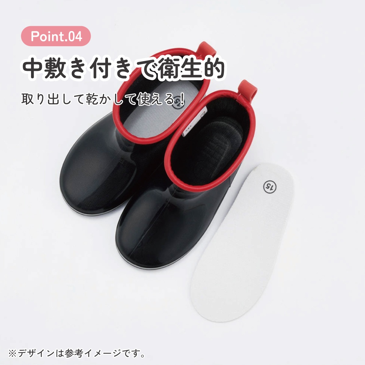 ブーツの後ろ側に雨の日に安心な反射テープ付き。
