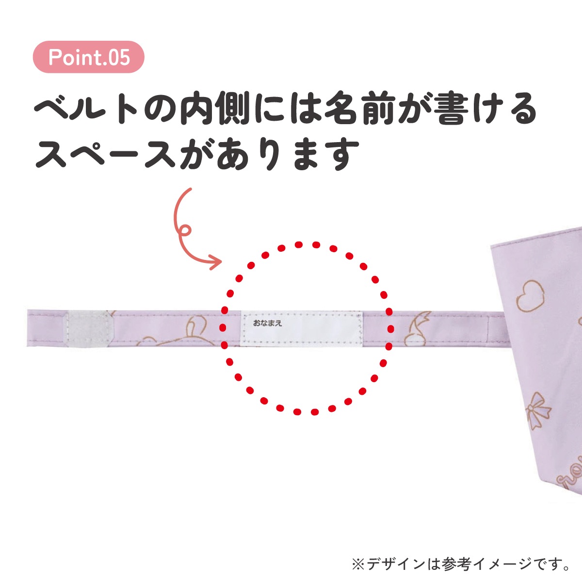 ベルトの内側に名前が書けるタグ付き。