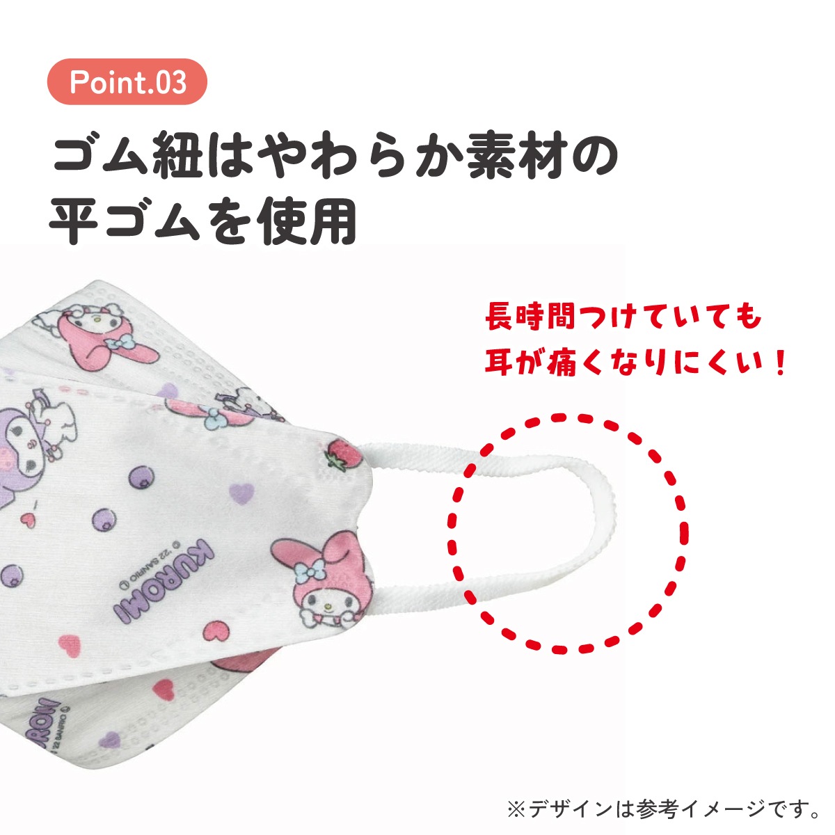 ■耳が痛くなりにくい、やわらか素材の平ゴム使用。