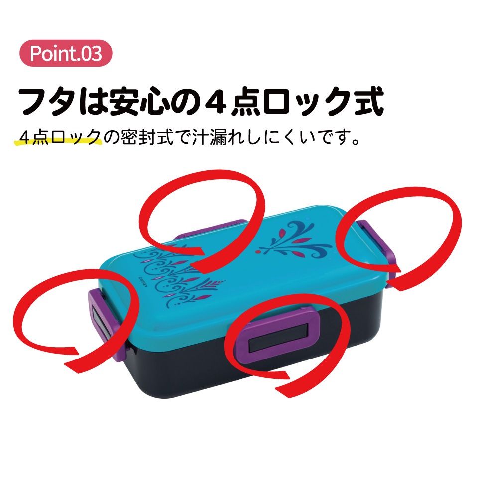 4点ロックの密封式で汁漏れしにくい。